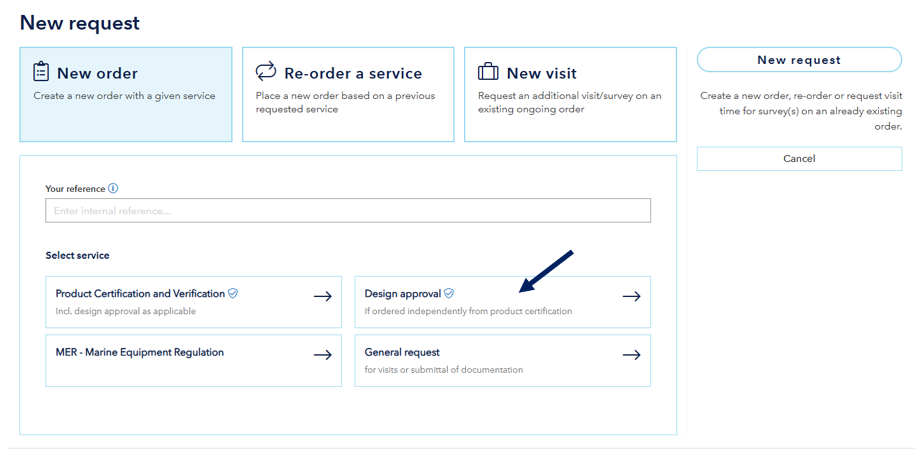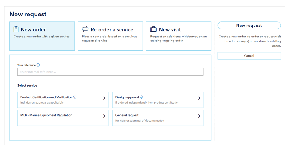 The registration of a new order starts with 'New request', top-right of the main page. You will then get the option to create a 'New order', 'Re-order a service' or to create 'New visit'.