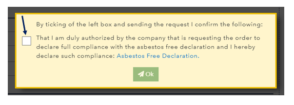 Finally you need to click again “send request” always in right side of the page and confirmation message that your product(s) is/are asbestos free shall be selected
