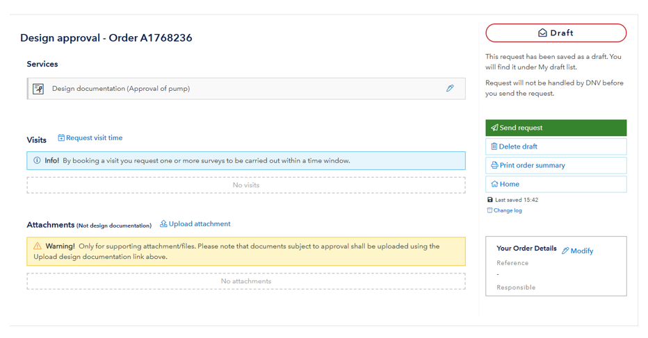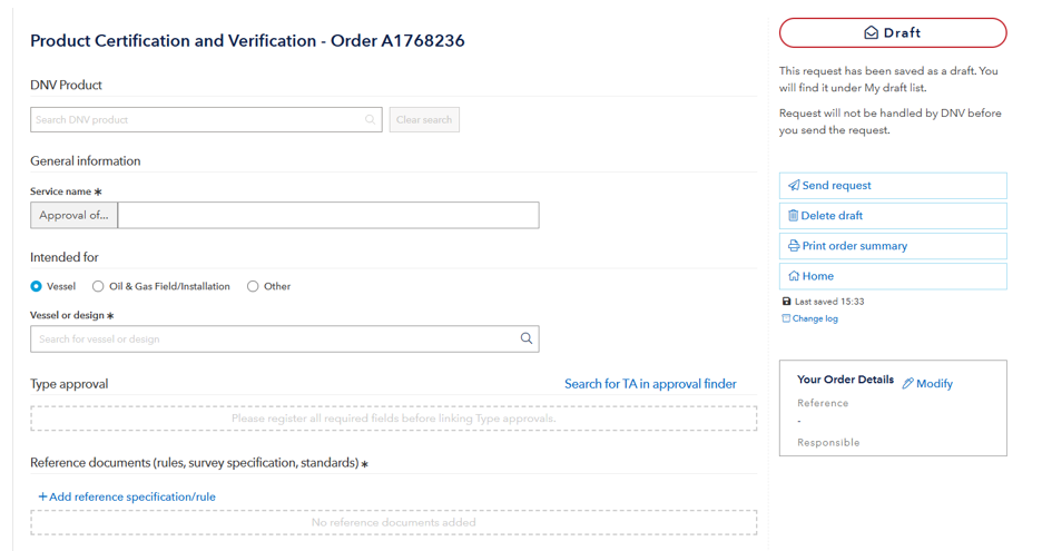 On the right hand side, you may already here upload order information. This will at least be done, when you send the request to DNV.