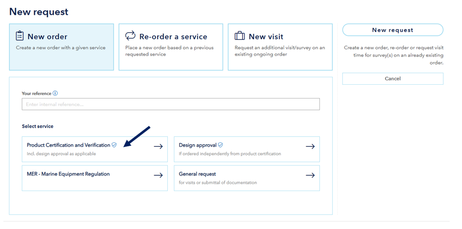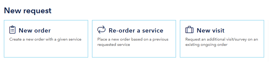 The registration of a new order starts with “new request”, top-right of the main page. You will then get the option to create a “new order” or to “re-order a service” or to “create a new visit”.