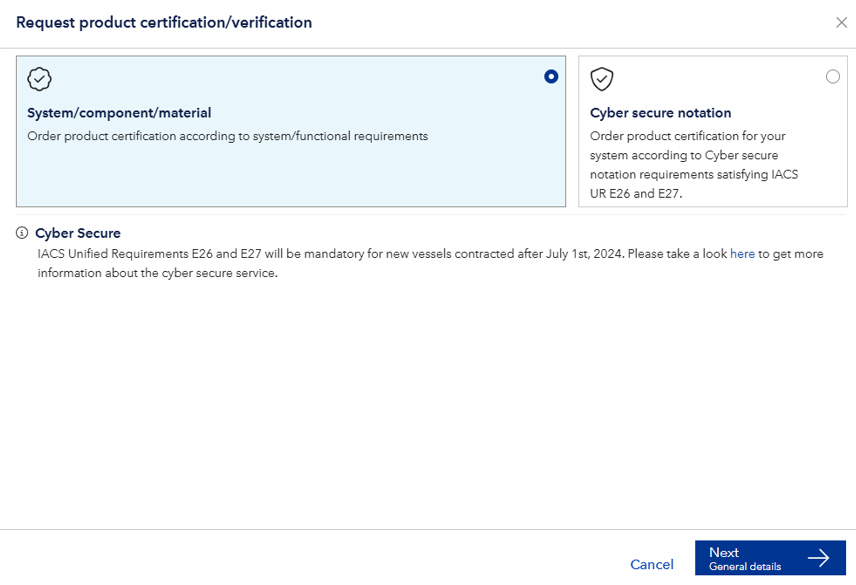Please click on this tile and continue with the registration, that is now split into a few steps. A first action that you need to do, is to select if the product under this scope of certification, is under Cyber Secutiry compliance IACS Unified Requirements E26 and E27 or not