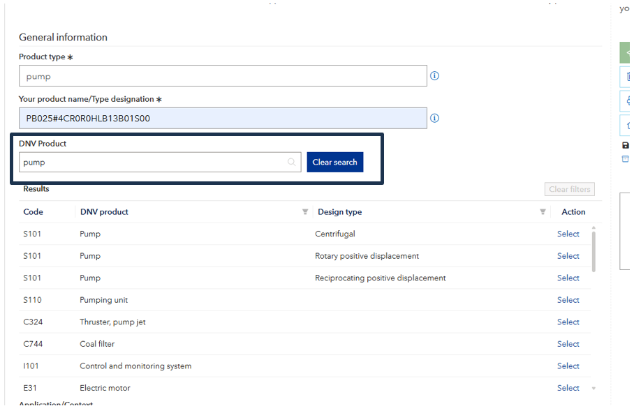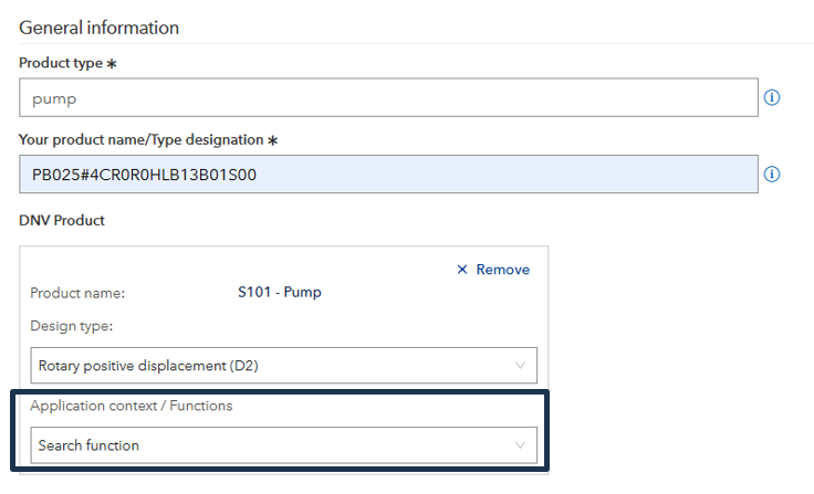 'DNV Product' is a field of DNV designation type of this product; when you enter the name of the product (e.g. pump), the tool show you a different possibility for a selection