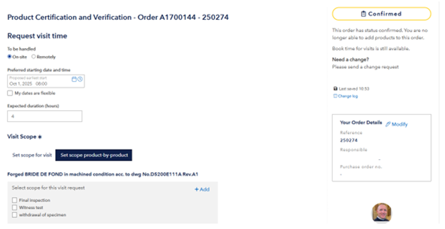 Please select the contact for the visit. By default the portal user is selected. But you may select other persons from “your company – contacts” | |