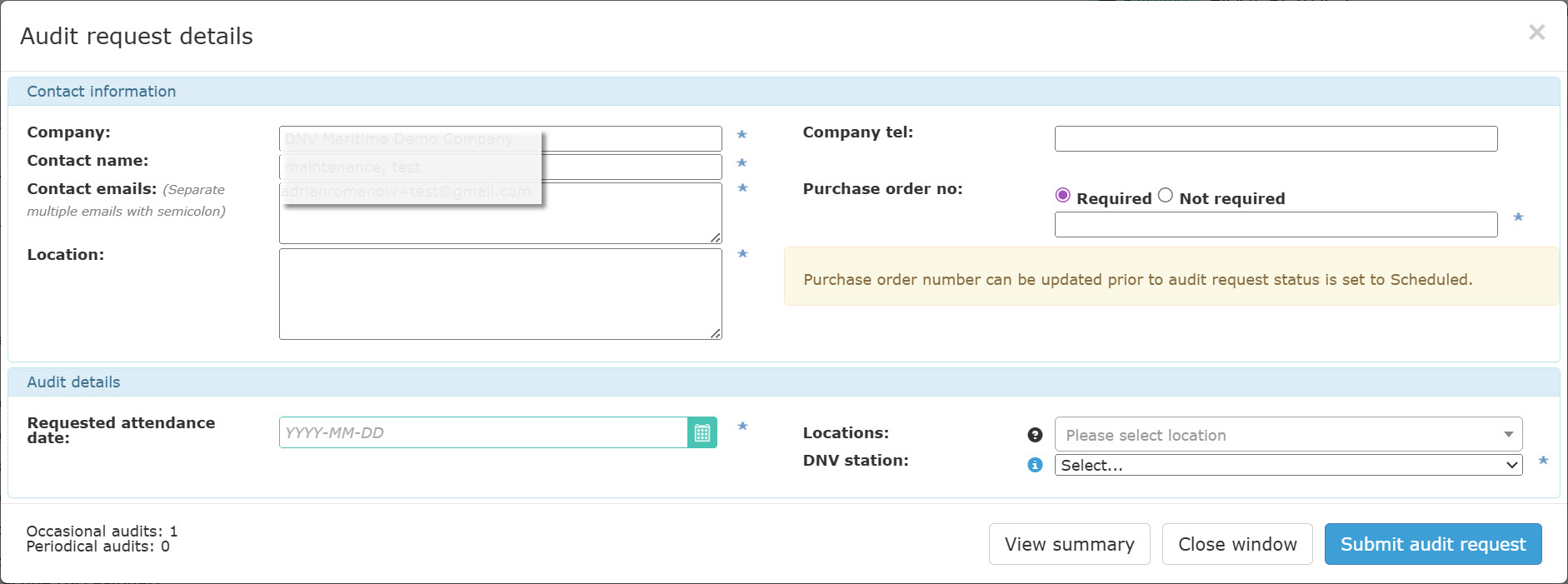 The Purchase order number can either be set to Required or Not required. If 'Required': PO number can be updated prior to audit request status is set to Scheduled. If 'Not required': Invoice will be issued without at PO reference. Adjustment to the invoice after it has been issued by DNV may lead to a handling fee'.