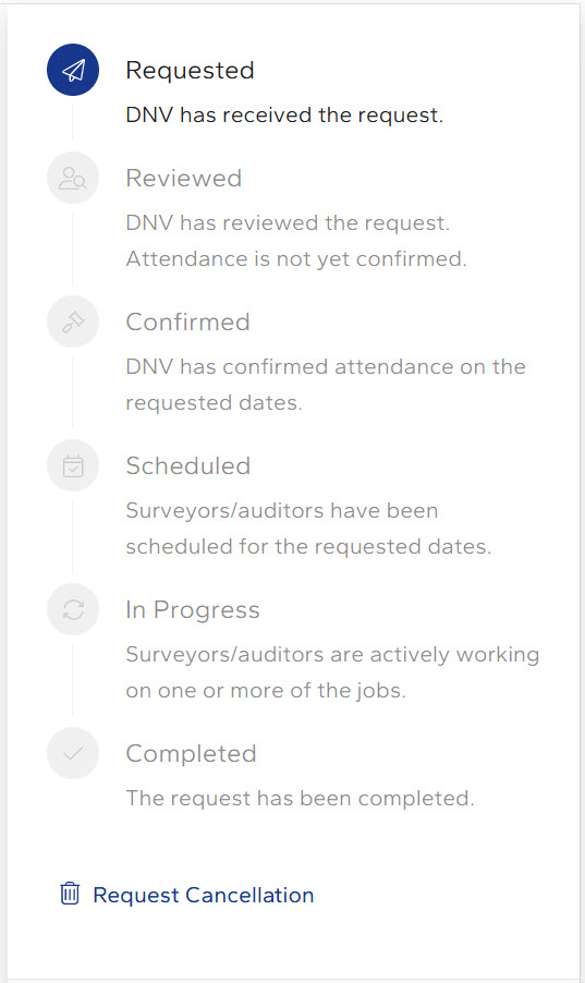 A Request Status indicator is also shown, for easy tracking of your request. you can also follow the progress to stay updated on the latest changes to your request. Below the status indicator, you may also request a cancellation of the request: