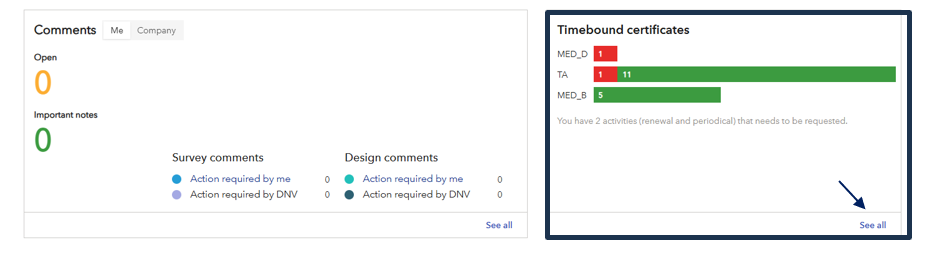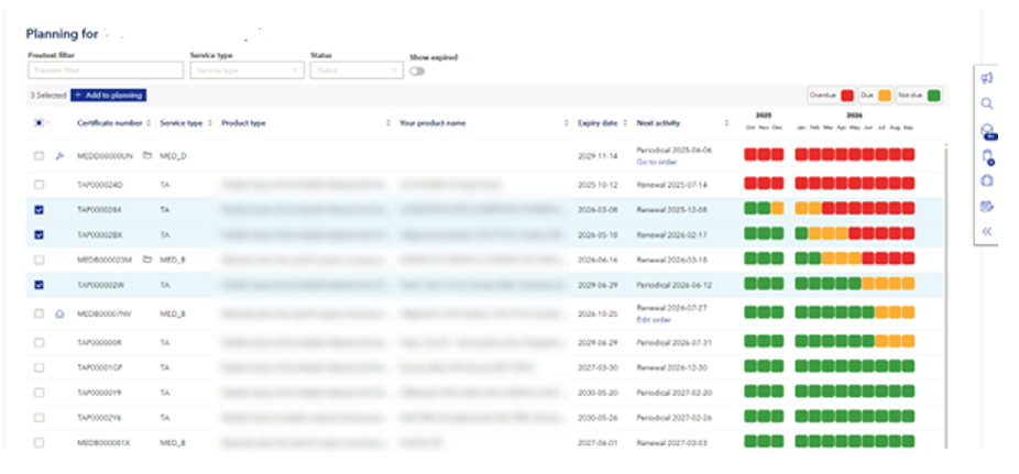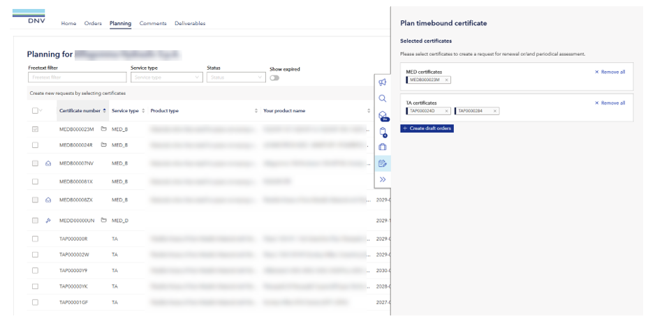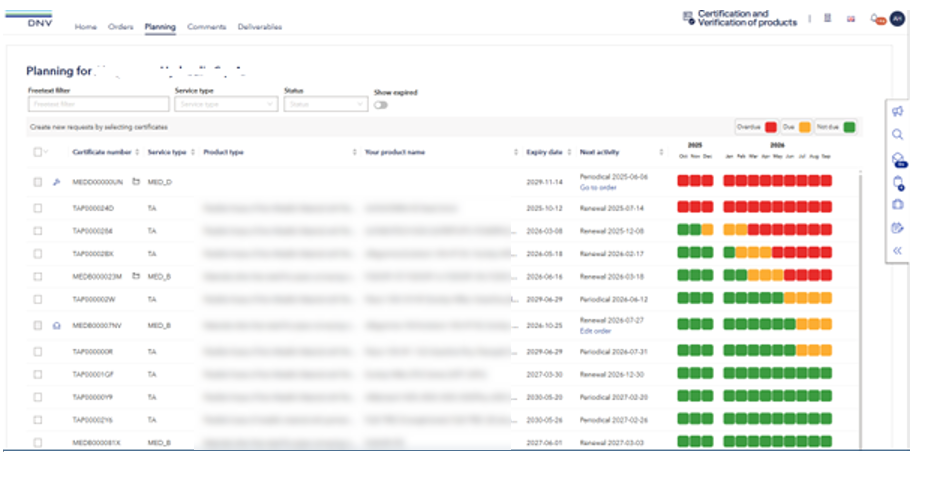When you click on “see all”, a dedicated page (planning page) gives an overview of all time-bound DNV certificates issued to your company and includes now an option to request orders by selecting one or multiple certificates.