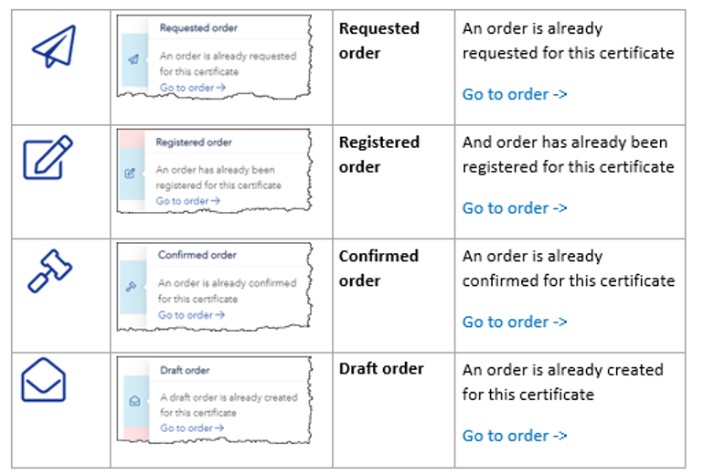 The certificate to which an order is created for will no longer be possible to select before the order is completed. A symbol next to the certificate indicates the status of the order process. Please find explanation in the table below.