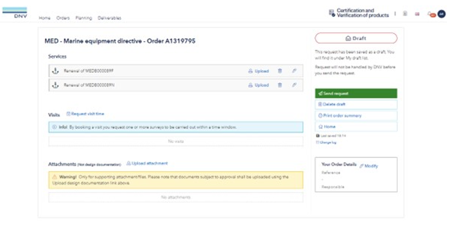 NOTE: Please note that this service can be used to order periodic assessments / audits and renewal of certificates. Please use ‘+ New request’ to order initial certificates and / or modification of certificates.