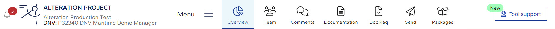The top menu contains the following tabs: Overview, Team, Comments, Documentation, DocReq, Send, Packages and a Tools support feature.