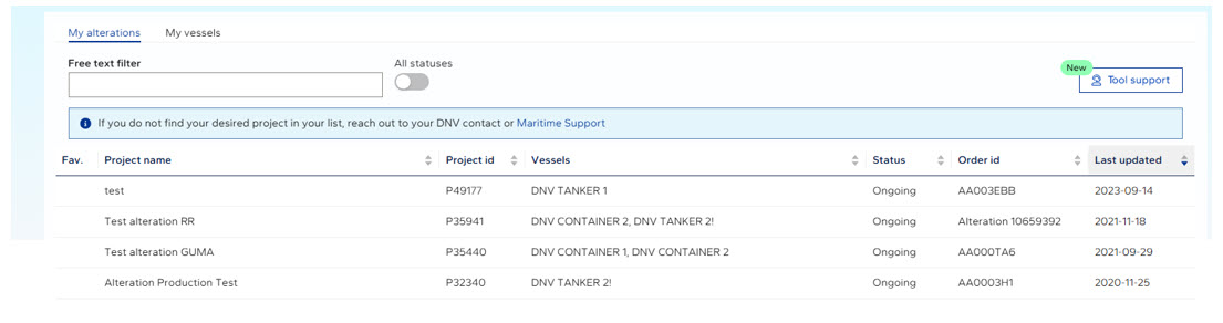 The 'Tool support' symbol allows you to create a support case if you nee help on setting up the request and use the tools. This functionality is also available when opening/selecting a project.