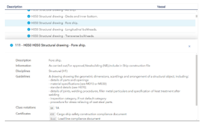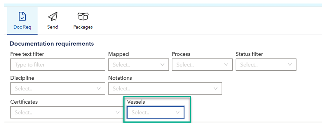 The default view for the documentation requirements is for the entire project. The column "Vessel" shows the Vessel name for the vessels, if it is blank that means that the requirement is valid for the entire project (all vessels). To see the list for one or more specific vessels, use the filter “Vessels”.