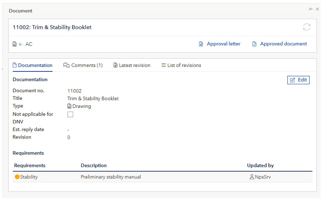The Expected delivery date column will display the date when the documentation can be expected to be received from DNV. If empty, it means the date is not yet set.