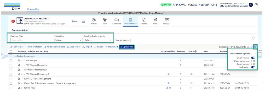 It is also possible to set ‘Detailed view options’ eg, hide empty folders or show open comments. By selecting requirements, the document requirements that are connected to the documents are shown below the document. A new filter appears with possibility to filter mapped or unmapped documents ('mapped' means mapped to a Documentation requirement/DocReq).